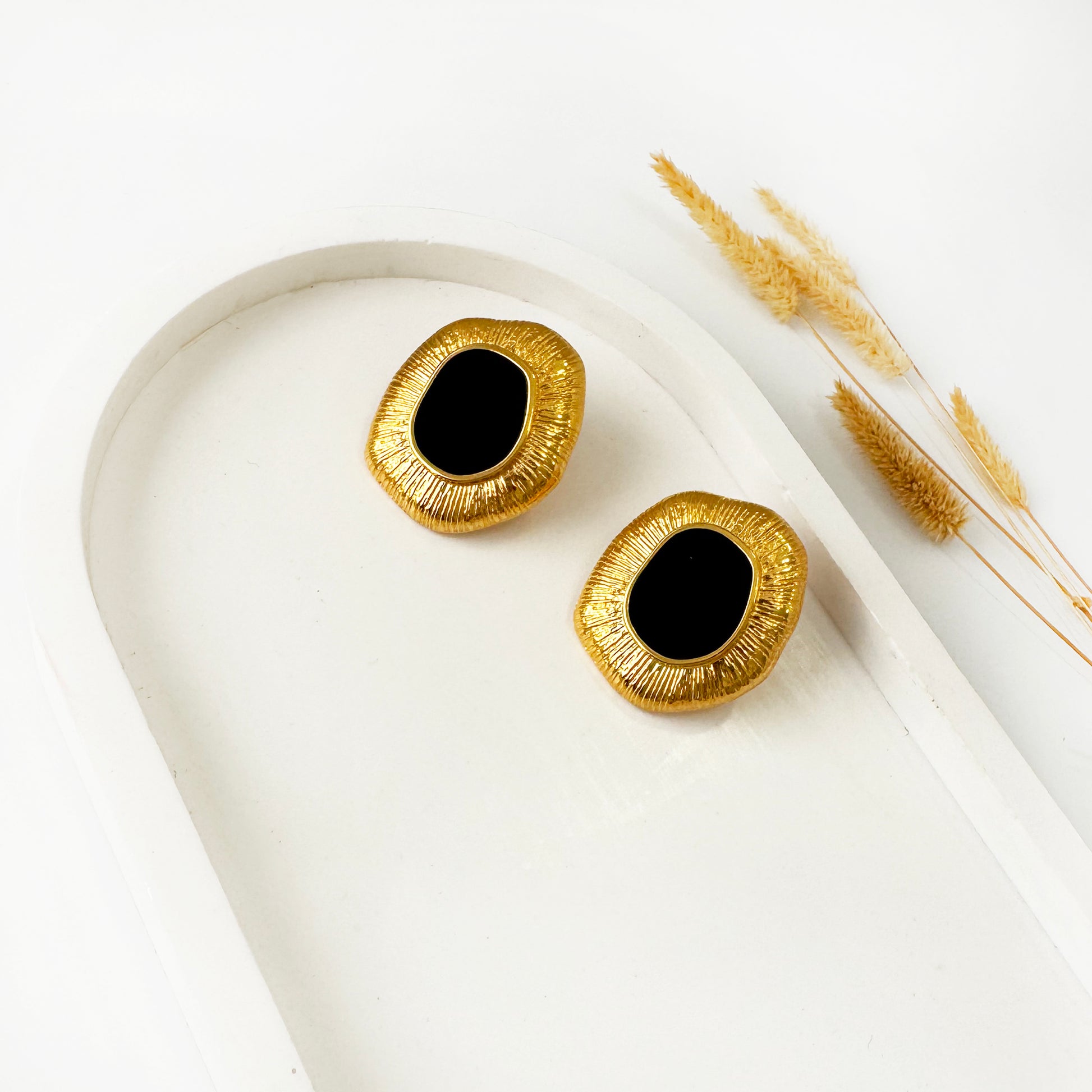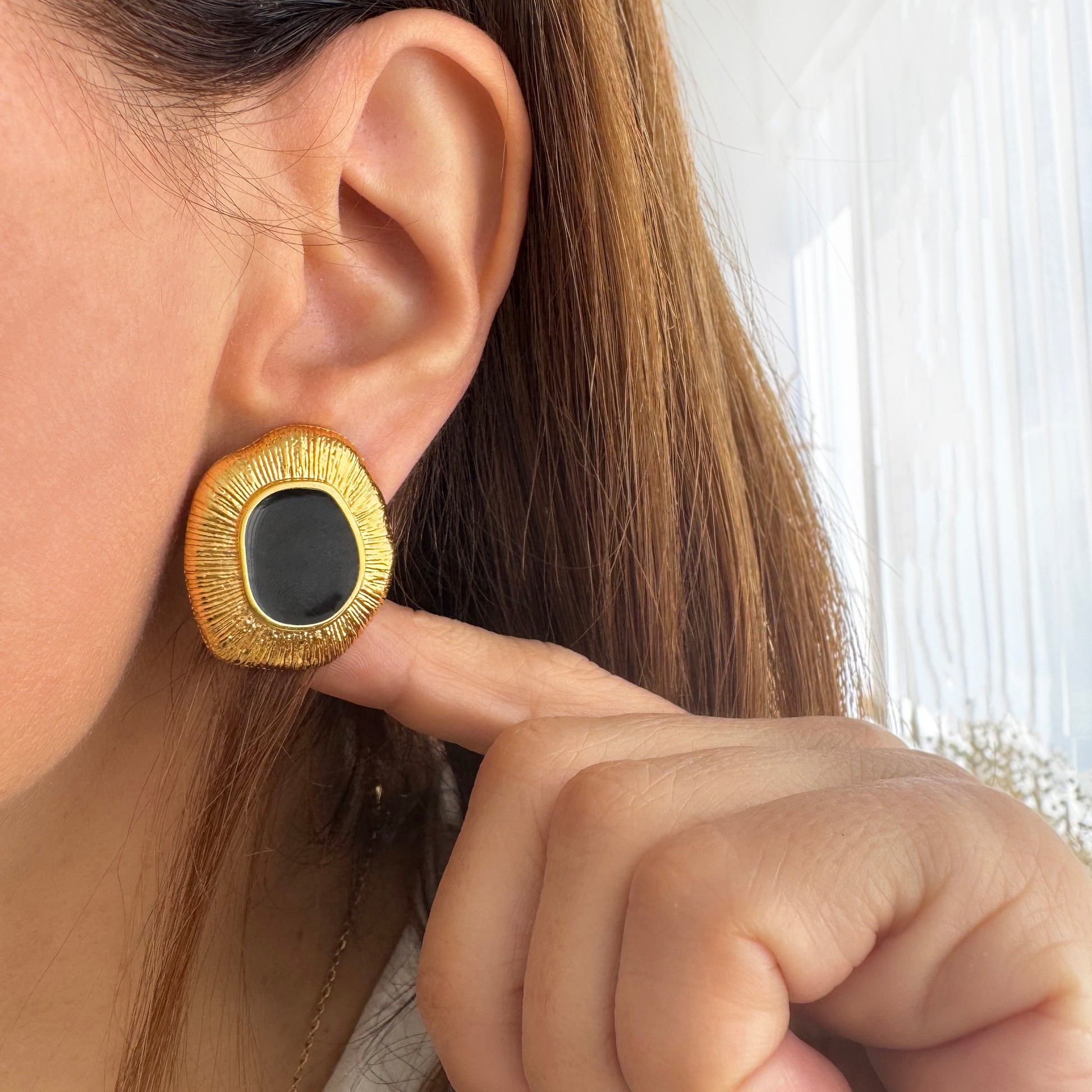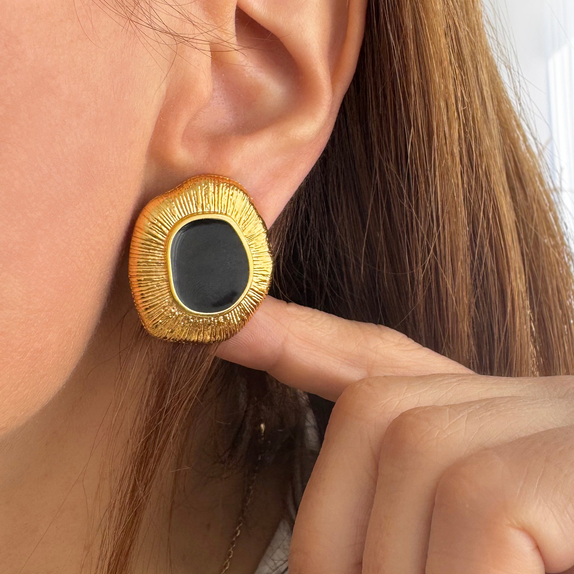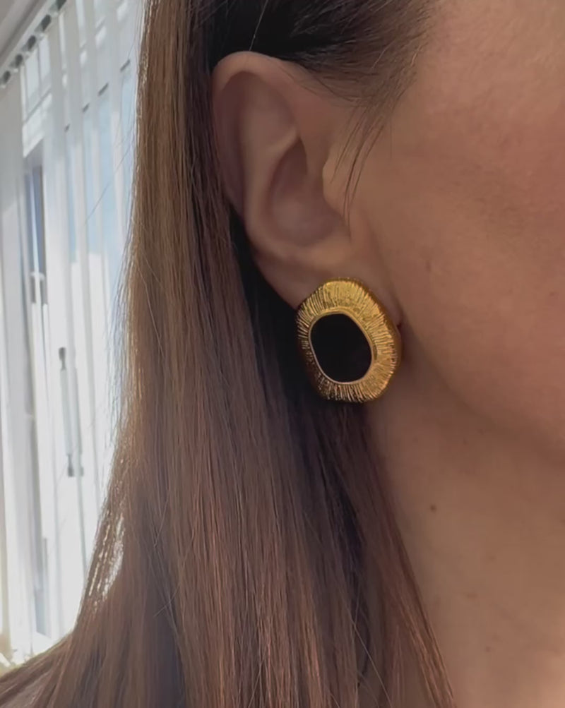 Εντυπωσιακά σκουλαρίκια με μαύρο σμάλτο και ανάγλυφη υφή.