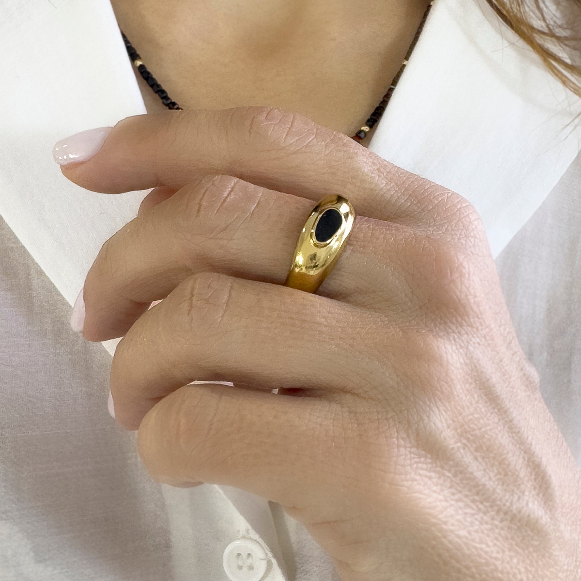 Elevate your style with this Dainty Gold Ring that is hand-painted with black enamel!