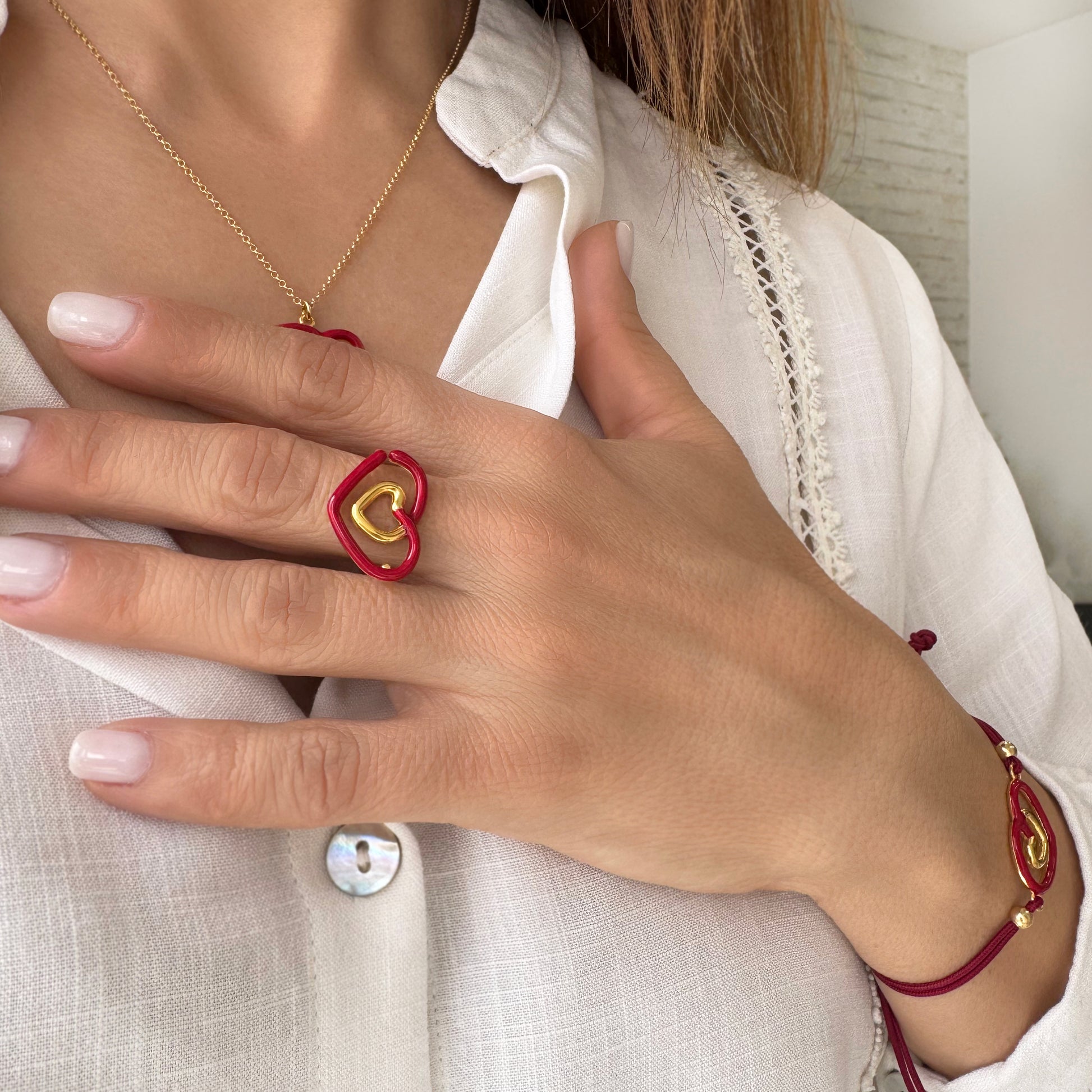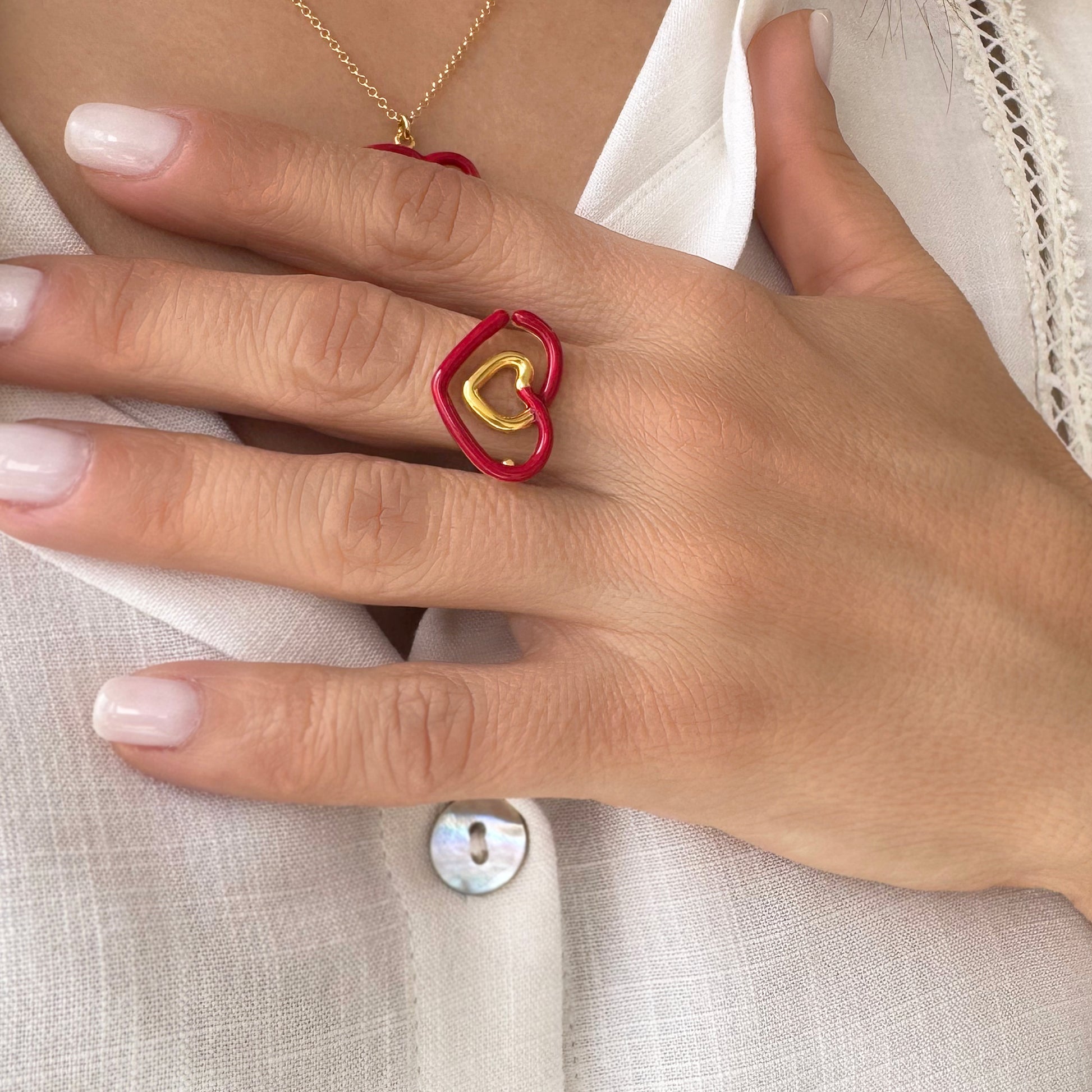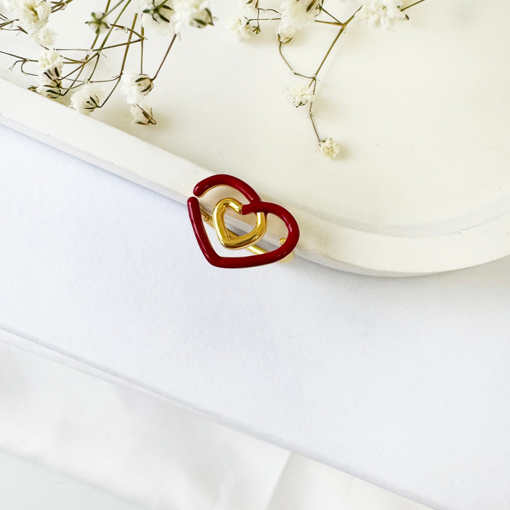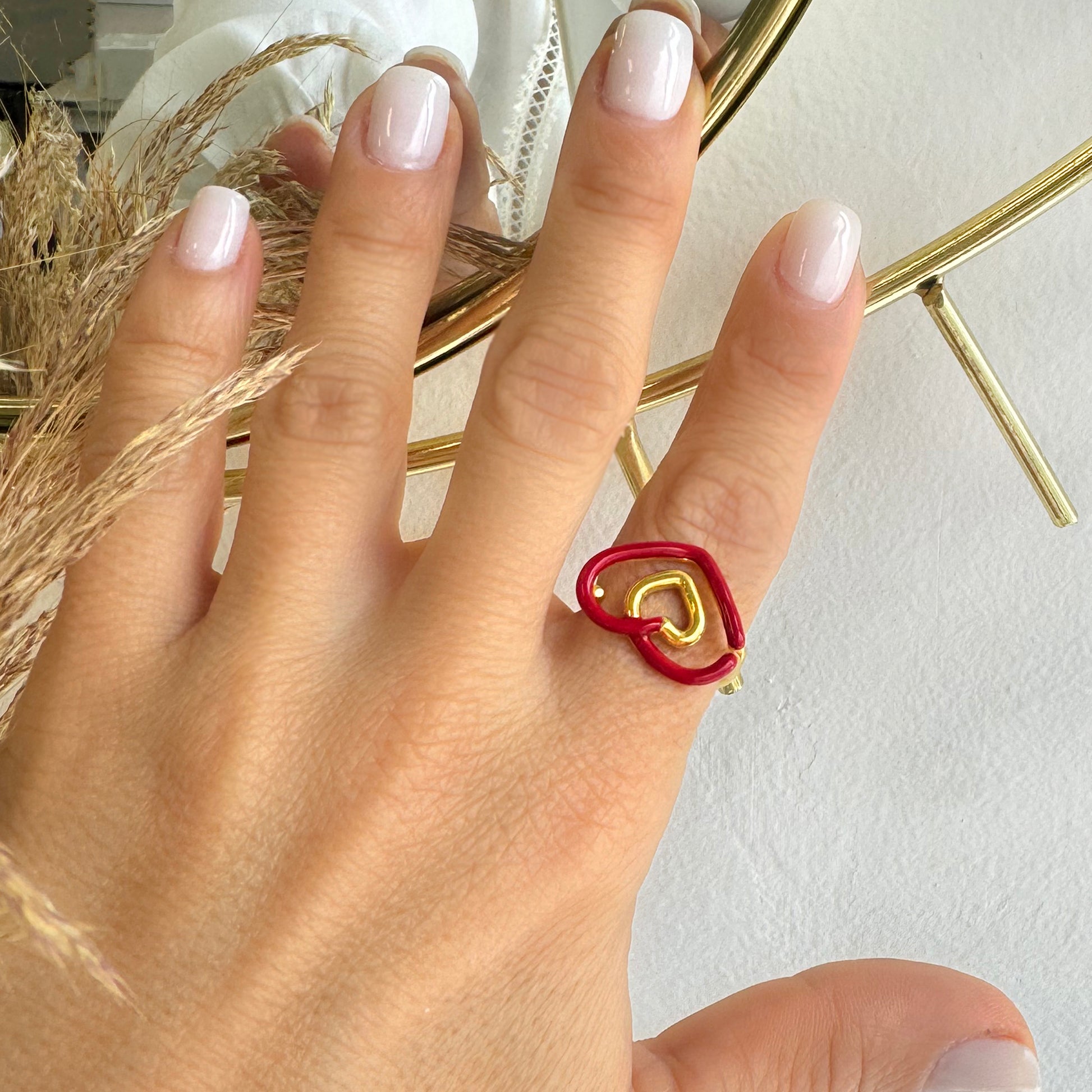 Romantic ring with a red shiny heart that is hand-painted with enamel!